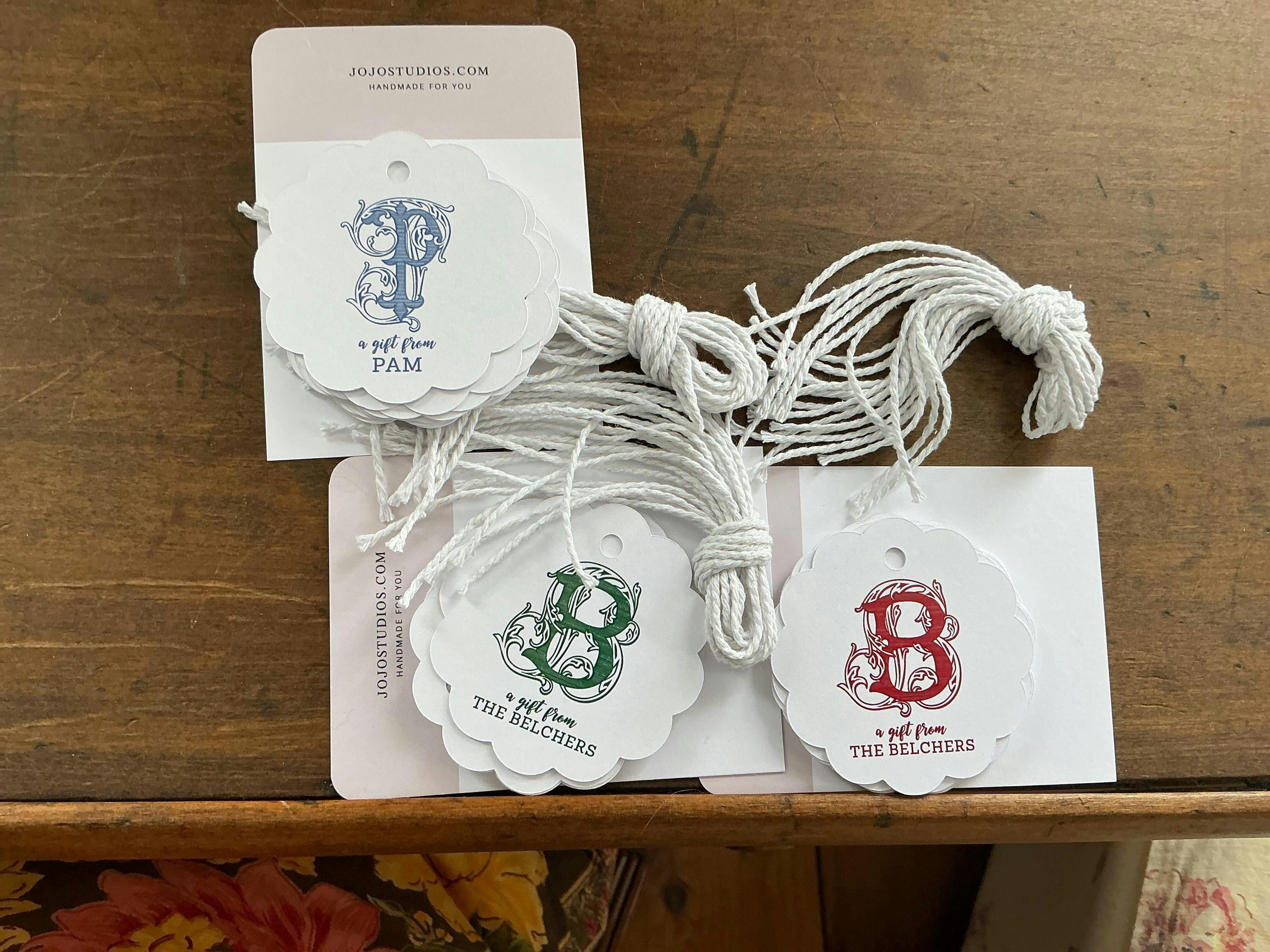 These are SO pretty!! I ordered Hunter green and Apple red w/ my last initial, thought they’d be perfect for Christmas gifts, bottles of wine and other Christmas giveaways. Then I ordered one w/ my first initial and name in French, to use for co-workers and non-Christmas items that are just from me, not my husband and I. They are ALL so pretty!!! I wasn’t sure how my first initial would look, I think the W example is so pretty, but honestly they are all super pretty. Already thinking of ordering more things from this seller. LOVE the quality tags!