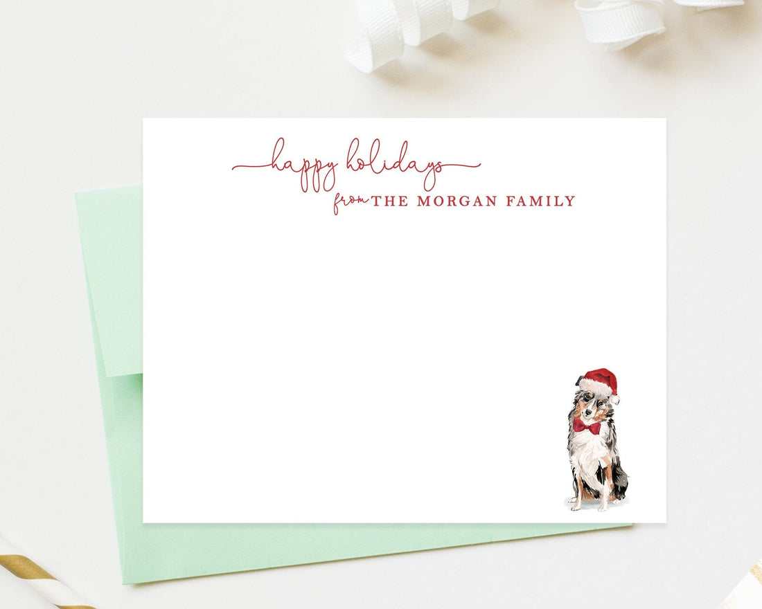 Personalized Australian Shepherd Christmas Stationery, Happy Holidays Note Cards with Dog, Santa Hat, and Christmas Lights, Holiday Card Set