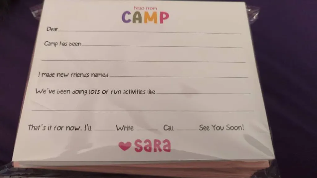 This item is PERFECT for my 9-year old granddaughter who is going to sleepaway for the first time. The card is just the right size, with lines to write on. Great colors and font. She's going to love it! Came in a few days, even sooner than expected.