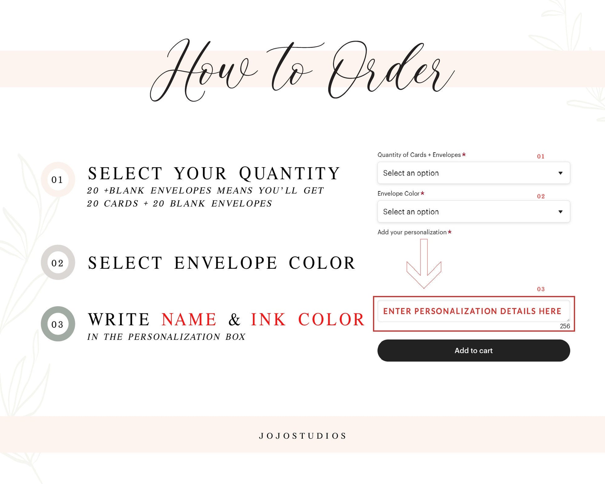 This is a set of personalized A2 sized stationery flat cards. Printed on premium 110 lb heavy cardstock with your choice of ink colors and envelope colors. Each set comes with the same number of envelopes.