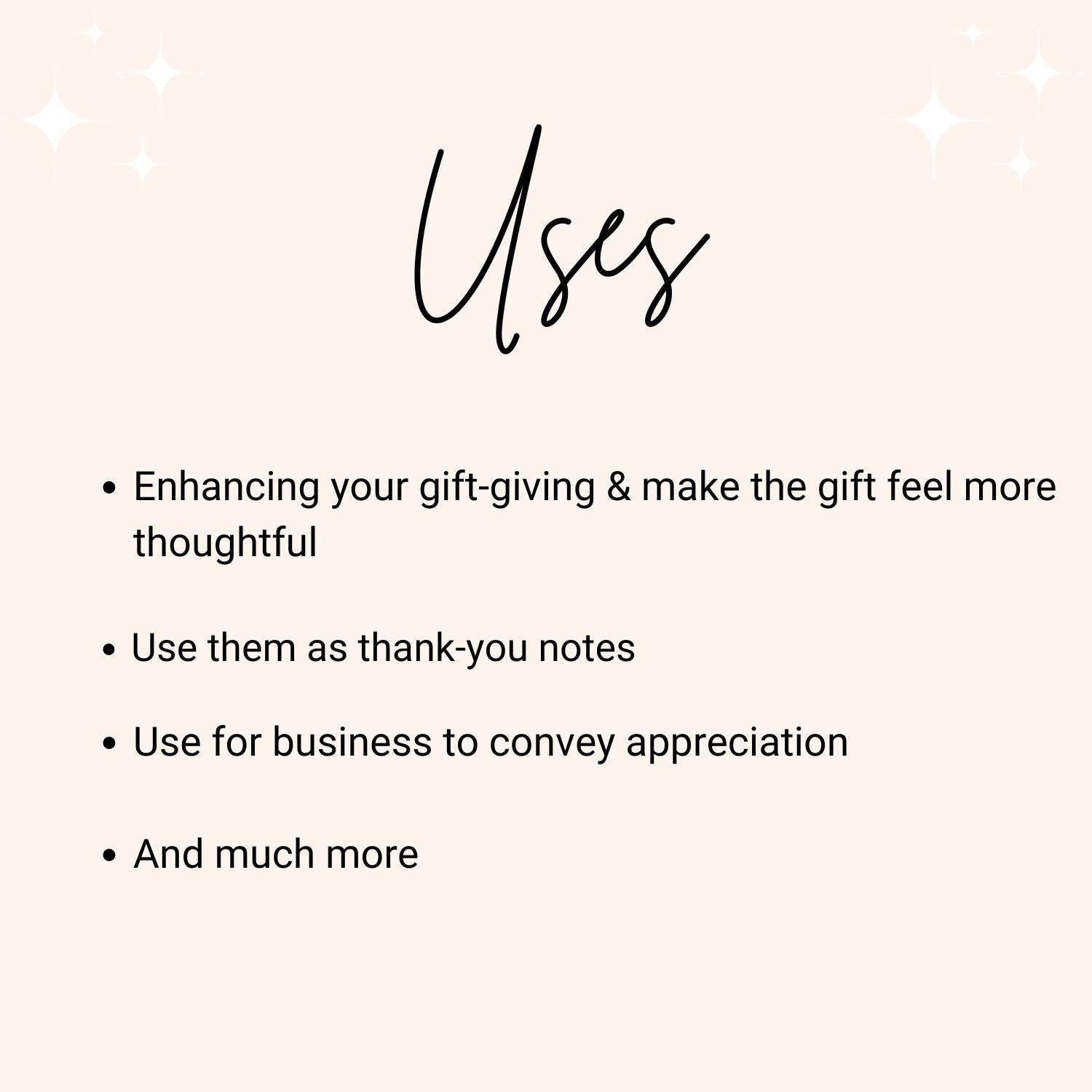 Make your gift-giving more special with an enclosure card or sticker, adding a thoughtful and meaningful touch. Personalize it with a handwritten note or message to accompany gifts, invitations, or greetings. Ideal for thank-you notes, holiday wishes, or celebrations, they’re a versatile addition to any stationery collection.