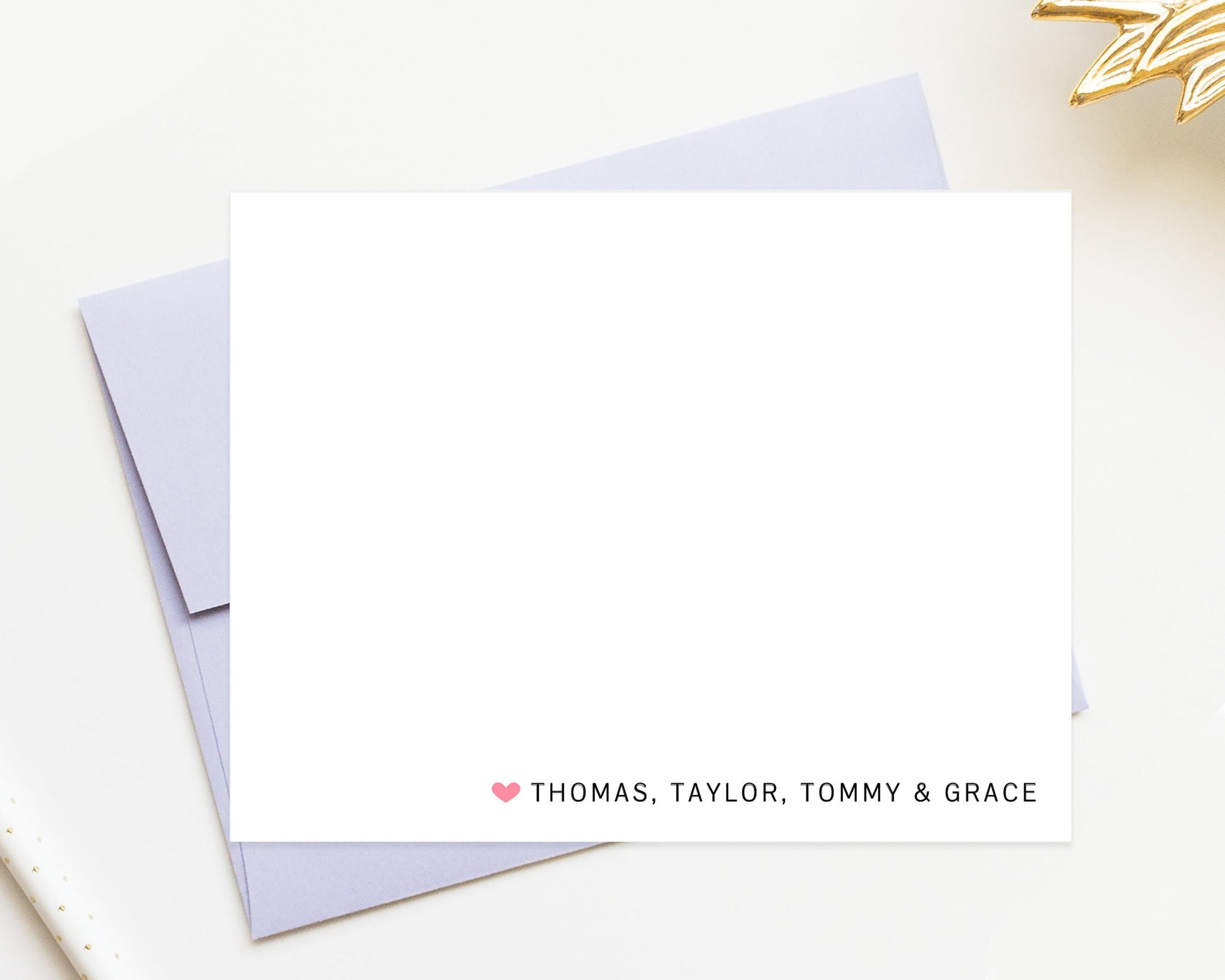Personalized Family Stationery with Family Names, Custom Stationary Note Card Set, Thank You Notecards with Heart and Envelopes, Modern Note
