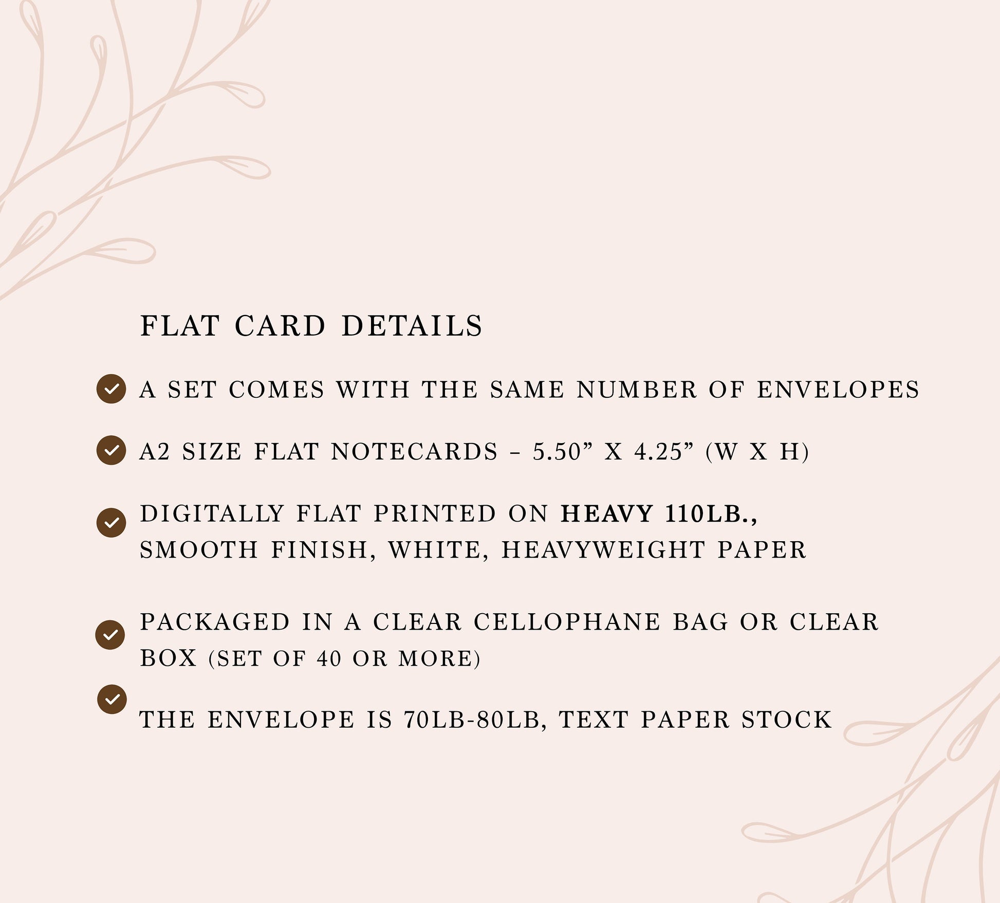 This is a set of personalized A2 sized stationery flat cards. Printed on premium 110 lb heavy cardstock with your choice of ink colors and envelope colors. Each set comes with the same number of envelopes.
